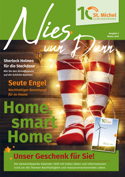 Unser Geschenk für Sie: Der Gemeindewerke-Kalender 2020 mit tollen Ideen und Alltags-Tipps rund ums Thema Nachhaltigkeit. Gratis für Sie in unserer Geschäftsstelle. Noch mehr Tipps, Veranstaltungen und Neuigkeiten finden Sie in der aktuellen Ausgabe unseres Kundenmagazins "Nies vun Dunn – Winterausgabe 2019".